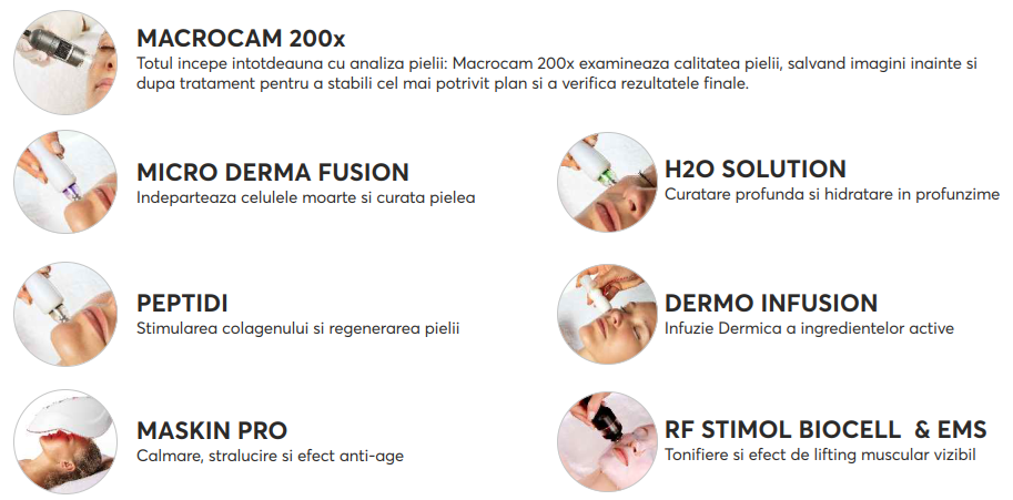 Tratament complet de rejuvenare faciala cu: Hidrodermoabraziune, RF + EMS aplicat pe masca de bioceluloza, Dermalinfusion (infuzie activi), LED Therapy.